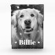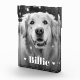 Photo block featuring your custom pet photo with with the pet's name as a white text overlay flanked by two hearts.