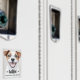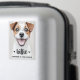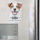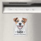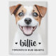 Pet photo memorial fridge magnet featuring your custom pet photo with with the pet's name as a black (or custom colour) text overlay flanked by two hearts and customisable text “Forever in our hearts".