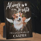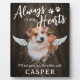 Rustic pet memorial keepsake plaque featuring a dark faux wooden background, the title 'forever in our hearts', paw prints, a photo of your beloved pet dog or cat, angel wings, their name, and the sympathy saying 'I'll see you on the other side'.