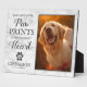 Pet dog memorial plaque featuring a framed treasured photo of your beloved dog, a modern white marble background, a paw print with a heart, a sympathy remembrance quote that reads "you left your paw prints forever on my heart", plus their name, and dates.