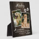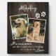 Country chic pet memorial plaque featuring a dark rustic wood effect background, your dogs initial & name, 2 photos for you to replace with your own, heart paw prints, and a sympathy quote that reads 'memories are the heart's way of holding on to those we love'.