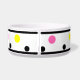 Polka Dots Personalised Pet Name bowls. Colourful geometric polka dots with black border trim and pink, yellow, turquoise, black dots against white background. Personalise pet's name in bright sunny yellow rectangle frame with text in black. Bright, fun fresh trendy circular shapes. Click to personalise and customise dots colours, if you wish. Original artwork design by TamiraZDesigns. www.zazzle.com/tamirazdesigns