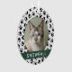 Personalize this stylish paw print Christmas ornament design with your pet cat (or dog) name and a favorite photo of your furry family member. Background includes a modern black and white pet paw print pattern with a hunter green accent stripe.