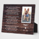 Our Pet Memorial Remembrance Keepsake Tabletop Frame/Plaque is a heartfelt tribute to your cherished pet. Featuring a faux wood plank background and the poignant words "When tomorrow starts without me...," this customisable frame/plaque allows you to display a photo and name of your beloved pet. Its sturdy construction and easel back make it a perfect tabletop display. Preserve the memories and unconditional love shared with your furry friend with this beautiful pet memorial keepsake. Order yours today and honour your pet's lasting impact on your heart.