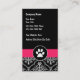 Pet care business card template including a dog paw print and stylish damask pattern, along with text layout you can customise online. Designed for any business theme related to dogs, pets, pet health, or pet services and presented in vertical format.