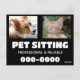 Pet sitting business advertising postcard with attention getting photos of a cute dog and cat and easy to read text. Change the photos out for your own if you like, edit the text, add printed text on back or use for a personal handwritten message.