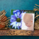 Pretty garden scene featuring coloured daisies of blue, lavender and yellow with a background of green. Name and birth date are printed above child's photo. Text template is customisable; you may add a short message instead. Photo may be of baby boy or girl, older female or couple. Wonderful gift for grandparents!