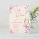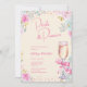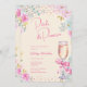 Petals & Prosecco Bridal Shower Invitation with champagne colour background and pink sparkles, pink purple and blue florals, and pink calligraphy script. A sweet, coquette pink bow ribbon tied around the champagne flute.