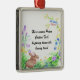 This design features a brown bunny as Peter Cotton Tail. He is sitting in a bed of greens and flowers shaped in a horse shoe. The flowers in blue, green, purple and yellow are in bloom and at the top is a bird perched on a vine of flowers. These ornaments are dated on the reverse side on some styles. Put all your own information on this ornament. Available in assorted styles.