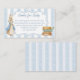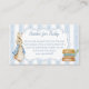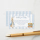 Peter rabbit with a blue jacket and garden vegetables baby shower book request enclosure cards. A cute bunny in a blue jacket standing in veggie garden for a baby boy baby shower books for baby cards pastel blue vintage stripped background peter rabbit baby shower enclosure cards