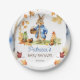 Peter rabbit fall baby shower tableware personalised paper party plates, a cute watercolor bunny with a blue jacket holding acorn basket oak trees yellow leaves, lovely table decor for your baby shower.