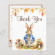 Peter rabbit fall themed baby shower template thank you card, a cute bunny in a blue jacket with mushrooms and fall leaves, nice for autumn time functions.