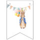 Peter the rabbit holding colorful balloons with party bunting flags.