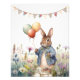 Peter the rabbit in his blue jacket with colorful balloons and wildflowers