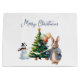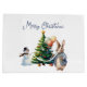 Peter the Rabbit with balloons and a Christmas tree and snowman