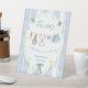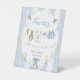 A Charming Delivery from Mr. McGregor's Garden! The Baby Shower Favour Pedestal Sign features a custom hand-painted frame of a crisp blue vertical stripe pattern accented with a lush greenery wreath, creating a clean, classic, and welcoming look. A sweet watercolor clothesline is strung across the centre, proudly displaying tiny, adorable items, each subtly featuring Peter Rabbit. The scene is completed with a darling blue bow holding a bunch of fresh carrots, and bright, cheerful daffodils, all rendered in a soft watercolor style. Easily add your own details and change the font style, size colour and placement if you would like to. This cute sign invites your guests to take a special favour in "hoppy" anticipation of your baby boy's arrival!