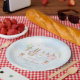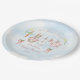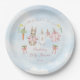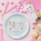 A Charming Delivery from Mr. McGregor's Garden! This paper plate features sweet watercolor clothesline is strung across the center, proudly displaying tiny, adorable items, each subtly featuring a pink clothed bunny in a Peter Rabbit style. The scene is completed with,cheerful daffodils, soft clouds in a light blue sky, and two bunches of carrots tied with a pink bow all rendered in a soft watercolor style. Easily add your own details and change the font style, size color and placement if you would like to.