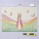 Peter the rabbit in a field of wildflowers surrounded by butterflies
