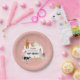 A hand drawn cute pink petting zoo party animals design featuring illustrations of a goat, goose, hamster, llama, pig, baby chick, cow and rabbit . A beautiful petting zoo themed design ideal for kids petting zoo themed birthday parties. Customize this cute petting zoo animals birthday paper plate and make it your own!