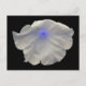 This pretty postcard features a photograph of a petunia flower that has been manipulated to make the centre of the flower glow bright blue. The outer petals are white and the veins running out from the centre of the flower also glow blue. The flower is on a black background to make it stand out.