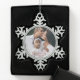 This pewter snowflake photo ornament is a beautifully crafted holiday keepsake, perfect for celebrating family memories. Shaped like a delicate snowflake, it has an elegant pewter finish that complements any Christmas decor. At the centre, a round frame holds your favourite family photo, encircled by intricate snowflake details. The words "Merry Christmas," along with your family name and the year, are printed in a crisp Christmas red, adding a joyful, personal touch. Designed to hang gracefully on your tree, this ornament will be cherished for years to come as a warm reminder of festive family moments.