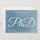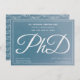 A PhD graduation party invitation in blue and white. This invitation also has a pattern of the word PhD, in script, on the back. The invitation is set to a shimmer paper for effect.