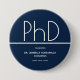 A favour button celebrating a PhD graduate with a blue and white design. This item is part of a graduation party collection that includes an invitation, photo announcement, paper napkins, place cards, and more. Customise these items, add them to your cart, and celebrate this major achievement.