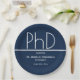 Paper plates for a PhD graduation party with a blue and white design. This item is part of a graduation party collection that includes an invitation, photo announcement, paper napkins, place cards, and more. Customise these items, add them to your cart, and celebrate this major achievement.