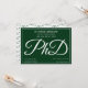 A PhD graduation party invitation in green with white letters on the front. This invitation also has a pattern of the word PhD, in script, on the back.