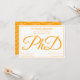 A PhD graduation party invitation in orange and white colours. This invitation also has a pattern of the word PhD, in script, on the back.