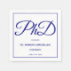 Paper napkins for a PhD graduation party with a white background and blue lettering.