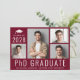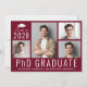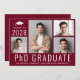 Modern burgundy red PhD doctorate degree graduation announcement and party invitation featuring a 4 picture photo collage, "PhD Graduate" written across the bottom in large white capital letters and the grad's class year, name and college or university in simple white typography. On the reverse side, add the party details.