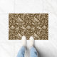 Doormat in a William Morris, Art Nouveau wallpaper design of pheasants and hares set among leaves, vines and flowers - beige on a chocolate brown background