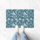 Doormat in a William Morris, Art Nouveau wallpaper design of pheasants and hares set among leaves, vines and flowers - subtly textured white on an indigo / denim blue background