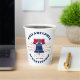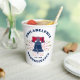 A patriotic illustration of a liberty bell ringing with a bold, modern, circular text that reads: Philadelphia, Pennsylvania, 1776 - 2026. This paper cup design has gold, blue and red colours on a white background. Great for the celebration of America's 250th anniversary in 2026.