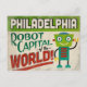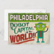 A funny Philadelphia Pennsylvania vintage travel postcard featuring a friendly robot with fun retro style text that says, "Philadelphia, Robot Capital of the world!"