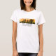Stylish women's tee features Philadelphia Pennsylvania city skyline silhouette with sunset watercolor splash background and latitude & longitude map coordinates on pale blue background.
