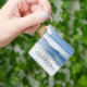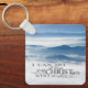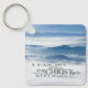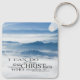 Christian inspirational quote scripture keychain depicts a nature photograph with blue mountains coved with a foggy cloud. It features Bible Verse Philippians 4:13, "I can do all things through Christ who strengthens me."