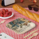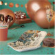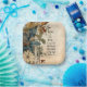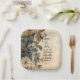 Inspirational quote scripture square paper plate depicts a nature botanical design with beautiful fall gold, burnt orange and green leaves on a tan background. It features a portion of an encouraging Bible Verse Philippians 4:13, "I can do all things through Christ."