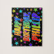 This vibrant, exciting, birthday-themed jigsaw puzzle design has the message "HAPPY BIRTHDAY, PHILLIP" with the characters having a colourful rainbow spectrum inspired gradient pattern, in addition to a lively star field background pattern. A vibrant puzzle like this might be a fun way to send birthday wishes to somebody named Phillip. [~Z0000468]