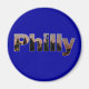 Inside the large letters spelling "Philly", there is the skyline at twilight.