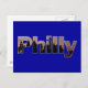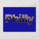 Inside the large letters spelling "Philly", there is the skyline at twilight.
