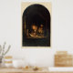 Mediaeval philosopher or alchemist studying books by candlelight, with a compass in hand, resting on a world globe, an hourglass and beaker on the table, the velvet veil pulled aside.