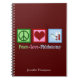 A cool custom phlebotomist notebook gift for an expert at blood draws and needles. A peace sign, heart, and vials of blood on a red journal. Peace Love Phlebotomy.
