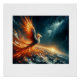 A majestic phoenix with fiery orange and red plumage rises against a cosmic backdrop, creating an ethereal scene. Spirals of stardust and celestial light surround the bird, illuminating its powerful form.