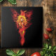 A woman that is a false with wings. A phoenix woman in red, yellow and orange flames in a backdrop of black.