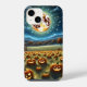 AI generated art of a spooky Halloween scene with a giant, glowing moon over a pumpkin patch and a farmhouse.
