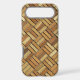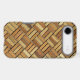 Basket weave pattern of brick wall in various shades or orange and yellow bricks.