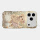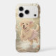 A minimalist phone case design featuring a cute puppy playing in the rain under soft golden sunlight. The puppy wears a pastel pink skirt and a small pink bow on her right ear. Surrounding her are simple plants and delicate flowers in muted earth tones and soft pastels. The overall design is clean and uncluttered, with a calm, dreamy aesthetic and a gentle, cozy feel.