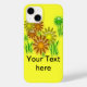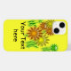 3D graphic of daisies in green, yellow and orange. Leaves of grass are interspersed among the flowers. Personalise by changing/removing text. Customise by changing background colour (currently yellow)